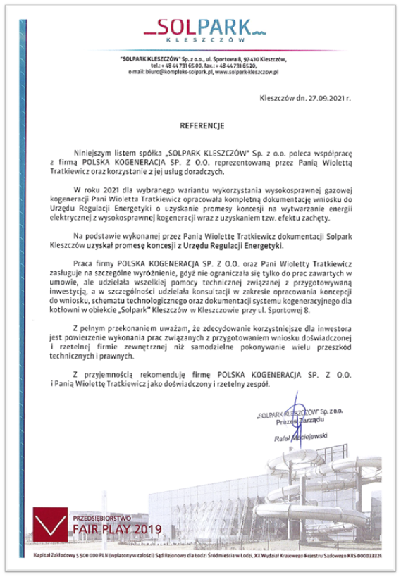 Firma POLSKA KOGENERACJA SP. Z O.O. dysponując własnym wieloletnim doświadczeniem zawodowym oraz wspierana przez swoich partnerów jest w stanie przygotować do realizacji oraz sprawować nadzór nad realizacją inwestycji w szeroko pojętym zakresie systemów energetycznych, szczególnie kogeneracji gazowych i poligeneracyjnych. Odpowiadając na Państwa zapytania wykonaliśmy już kilka analiz dokumentów istniejących pod kątem systemów wsparcia CHP w obecnym prawodawstwie polskim oraz w procedurach URE na potrzeby przyłączenia do systemu jednostki kogeneracyjnej w zakładzie produkcyjnym.